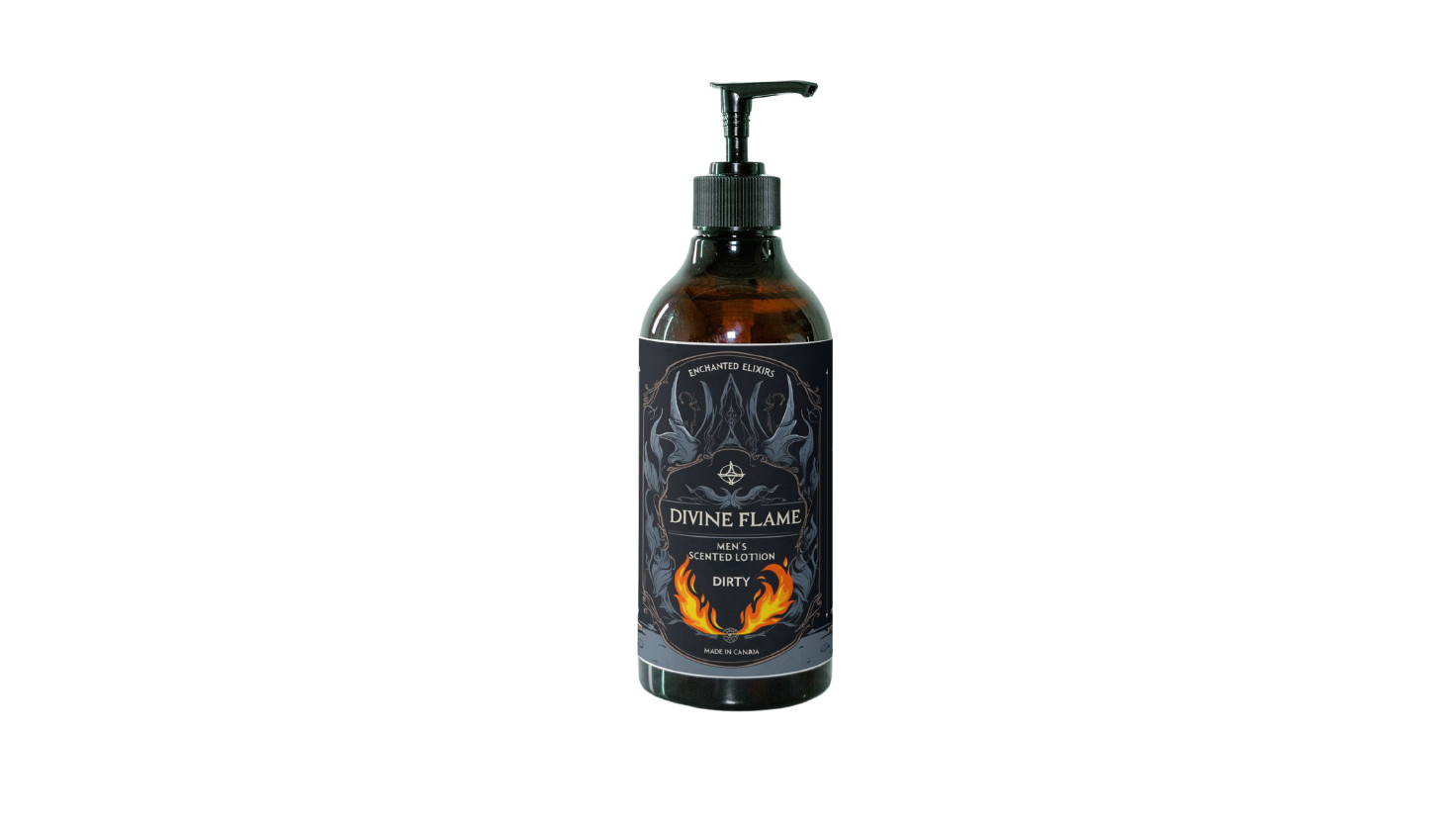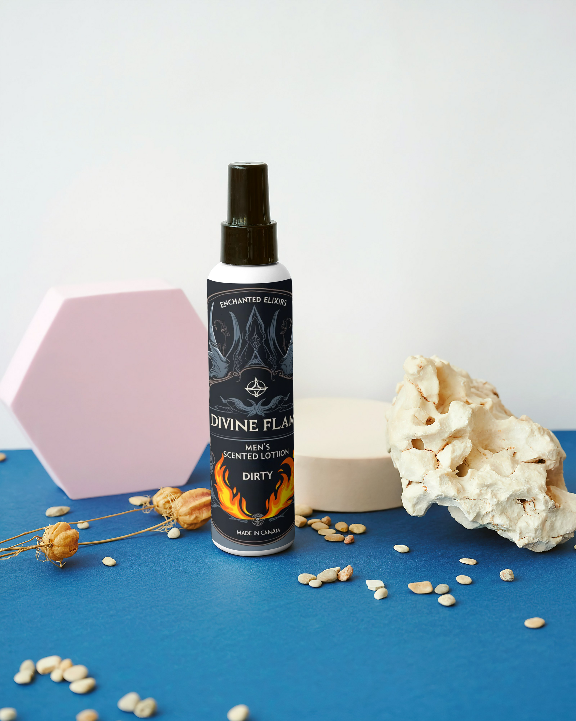 This men's lotion features a blend of spearmint leaves and orange peel, complemented by basil and lavender petals, resting on a foundation of sandalwood, oakmoss, tonka beans, and white musk.